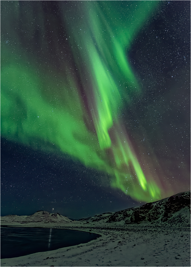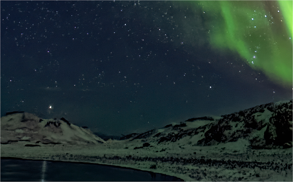 The image was captured on 21 Feb 2015 at 00.54.15 hrs local time in Iceland at Kleifarvatn Lake, a few miles east of Reykjavik.