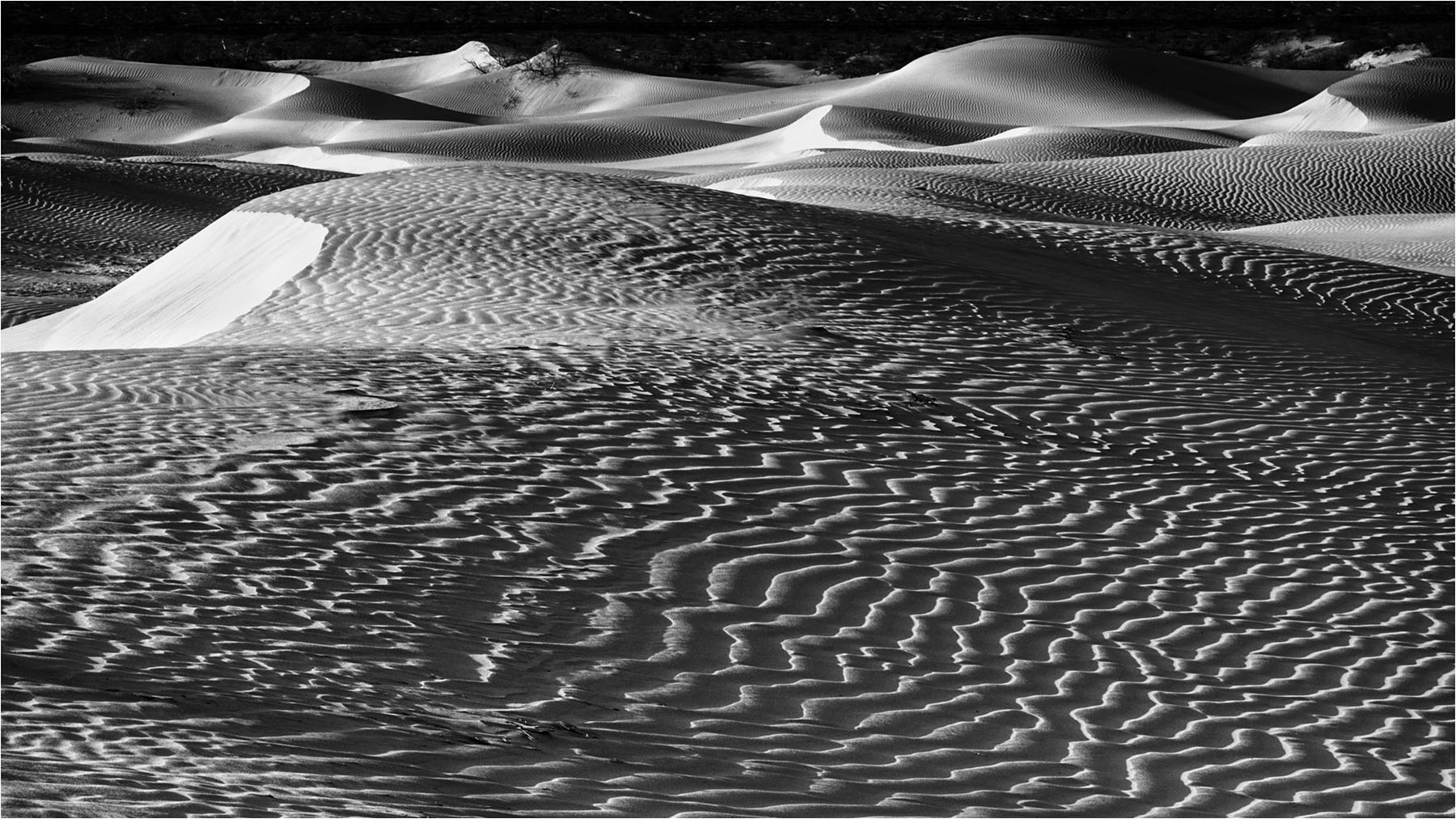 Ella - certainly brings back memories for me - was once in Death Valley at 130 deg F! I love the rippled dunes especially with the low light emphasizing their shape and texture and here the ripples lead the eye to the wonderful shapes and further ripples in the distant dunes. Great lighting to bring out the shape and form of those dunes. The dark sky (or shadow) at the top serves to hold the eye in the image. Well processed as usual and I would consider a further crop to 16x9, losing a little at the bottom. IMHO this would strengthen an already strong image. |