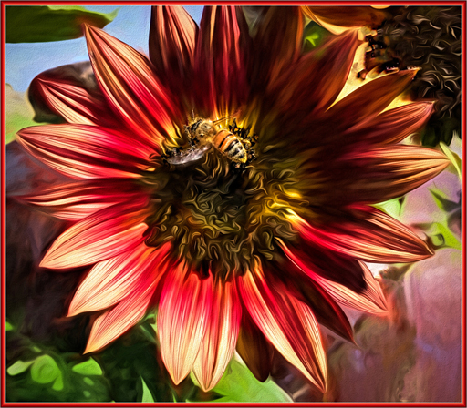 Another variation: I chose another sunflower with also another bee on it. I did basically the same think except left color in the background with less blurring and then masked back into the picture the bee. What do you think? |