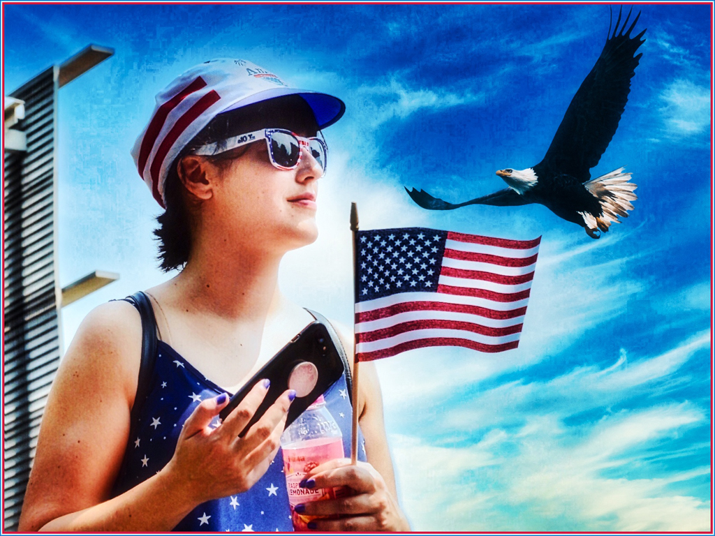 Dear Linda: first I would crop using he rule of thirds, placing her head right on the interest point. Second I would replace the blank background with a nice sky. Third I would lighten her face a bit and remove some of the imperfections in her face. Third , since the photo is of a patriotic theme place an flying eagle on a diagonal line running through her cell phone, the flag. See the image I did of your photo. Your really don't need to do the third thing, but your image needs a different background. For your information I did all the post production work using Skylum's Luminar AI. |
