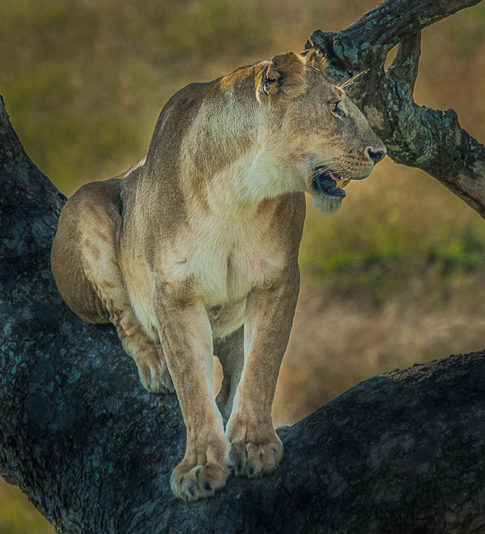 NICE CAPTURE, Rich.!!! The image is really sharp considering the circumstances. The color balance is also nice. The image MIGHT be enhanced by decreaing some of the bright yellow background either by desaturating the image or darkening the background. You also might consider cropping even further to focus the viewer's eye on the lioness. Brightening up the lioness and a bit of sharpening MIGHT enhance this already excellent image. GOOD WORK!!! |