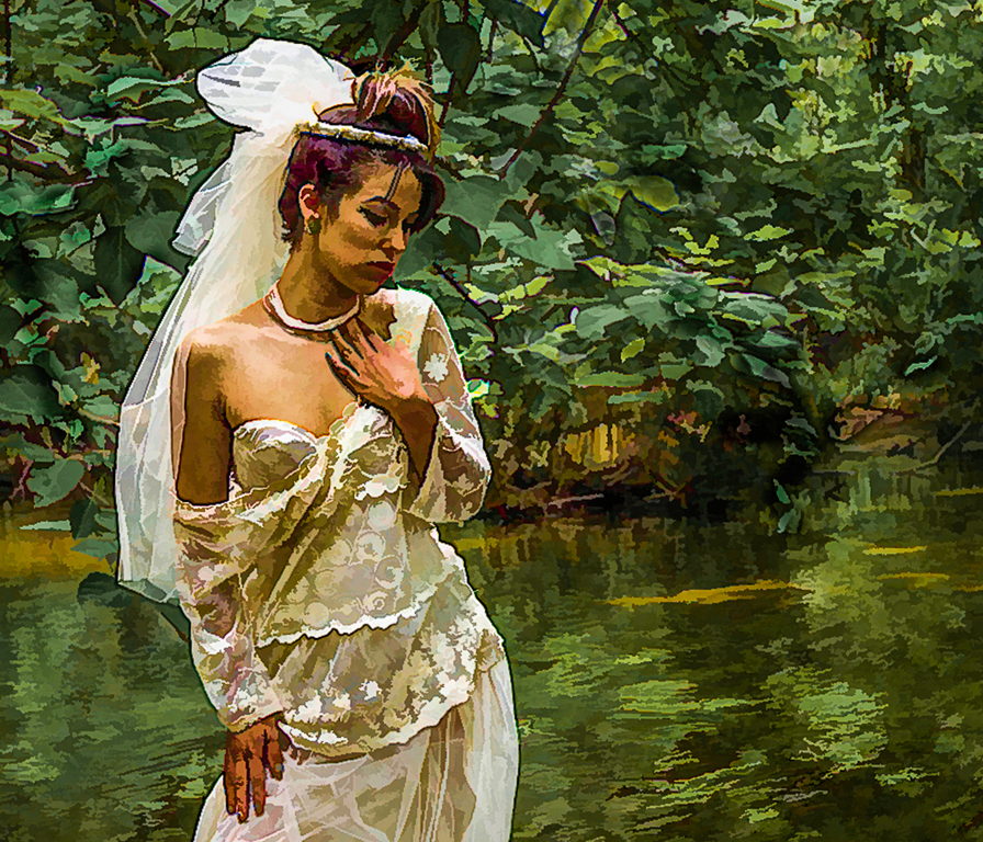 WOW!!! I really like what you're trying to do here. This is a very nice creative image. I particularly like the composition with the subject eccentrically posed and placed in a very feminine pose. My only nitpick would be that the top of the bride's veil appears to be a bit blown out and might be enhanced by decreasing some of the highlights slider. In addition, the bright green color tends to draw my eye away from the subject. By decreasing some of the saturation and luminance in the green, you remove this distraction and push your eye towards the center of attention-the bride. NICE JOB!!!!! |