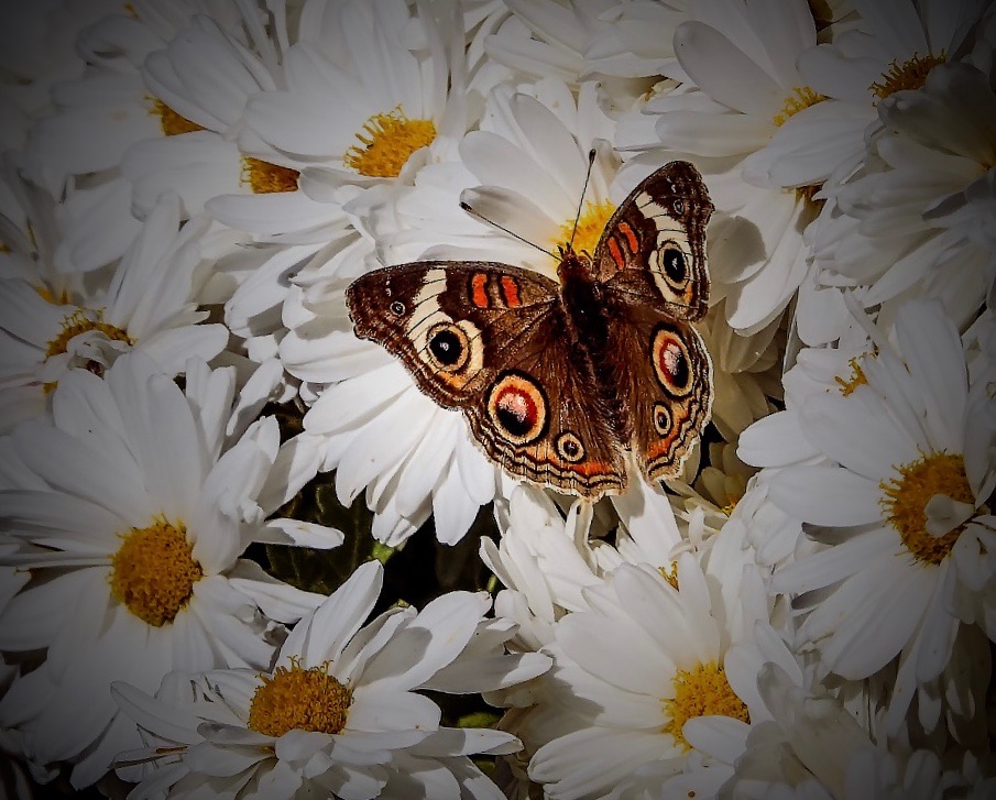 Excellent image of the butterfly against the white flowers. Though they seem to pull me away from the butterfly. I was trying to tone the white down a bit in my edit with out effecting the butterfly and just decided to go with the vignette instead. |