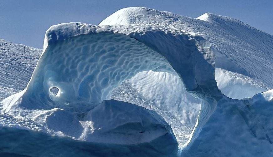 I like the hammered steel pattern in the snow or ice which accents the ice formation. I cropped the picture a bit towards the subject. |