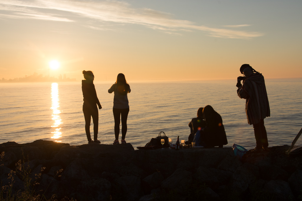 It's funny you should ask who was there. Besides the SLR photographers there was a group of 5 people standing in front and below us. They took pics on their phone and had a harp, a guitar and a bottle of wine to celebrate the solstice. Here's a grab shot taken after the sun had passed the CN Tower. The harp is at the extreme right. |