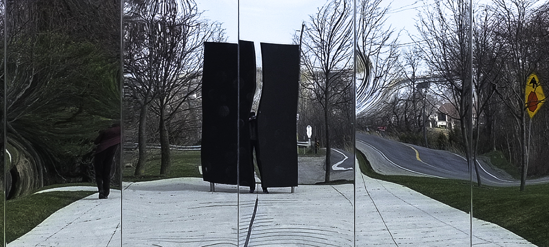 Here is a straight on image, but taken a fair distance back. Someone is walking through and I cropped to show only the reflected portion. I am standing behind the 2 piece monument. I like the distortion created by the mirrors. Taken on a Fuji X100 |