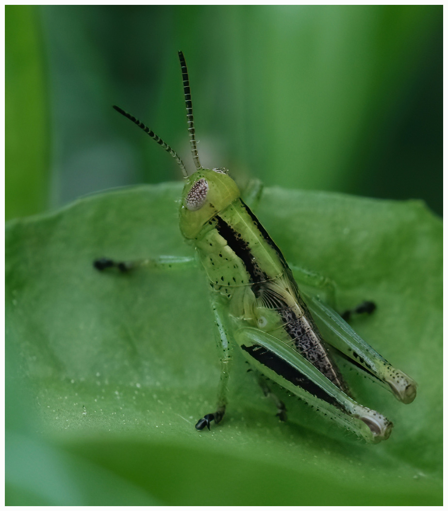 I appreciate all the details that you've captured on the grasshopper, especially the markings on his eye and antennae. The blurred background and subtle contours of the leaf work well. The cropping you used does eliminate distracting lines and light spot, however, I'd prefer slightly more cropping on the right side to give him more space ahead of him. |