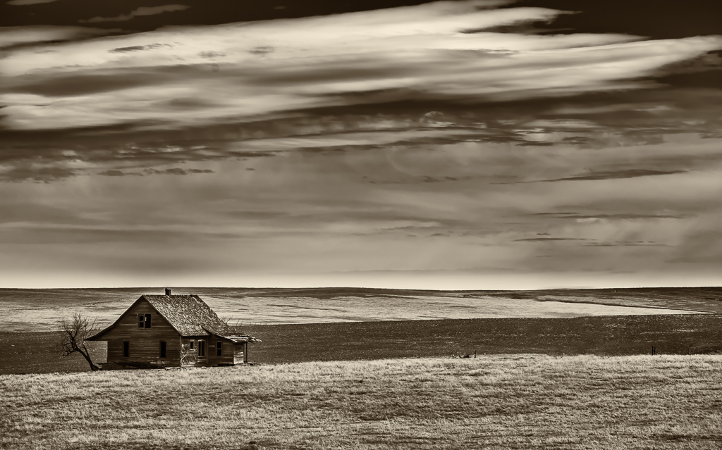 What if I clone out the tree on the right? I think it gives a better sense of the open space of the prairie. The image was almost too symmetrical with the tree there especially if I cropped to the right of the tree. I almost would have to crop the entire tree out.