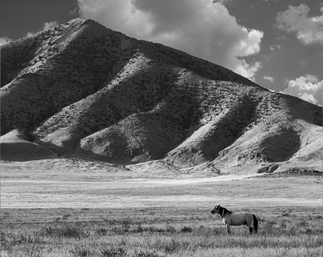 Excellent composition! I agree with Jerry - clear blue skies may look great in a color photo, but they do turn a featureless grey in a monochrome photo. You could replace the sky with one with clouds, but this would disqualify it for most nature photos and you don't want to detract attention from the horse. I did add clouds and adjusted sliders a tad to bring up the shadows. |
