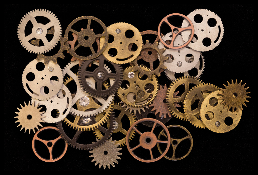 Carol, I'm having a tough time with this because I see some problems with your original image that I don't think can be overcome. The lighting has produced some blown-out reflections that I don't think you can recover with any post-processing technique. I think the lighting should have been softer and perhaps coming from different (lower) angles. I also think that the watch gears need to be arranged more neatly - there is too much chaos in the arrangement that you have here. I want to see the details in the gears, but the lighting and arrangement are not allowing me to do so. I attach an arrangement of gears that I photographed at a macro photo conference a few years ago - I cannot take credit for the arrangement that was done by someone else, but perhaps this can be used as an example of a more interesting way to do this, if you still have the watch gears. I think I used a diffuser to soften the overhead light that I had to work with. |
