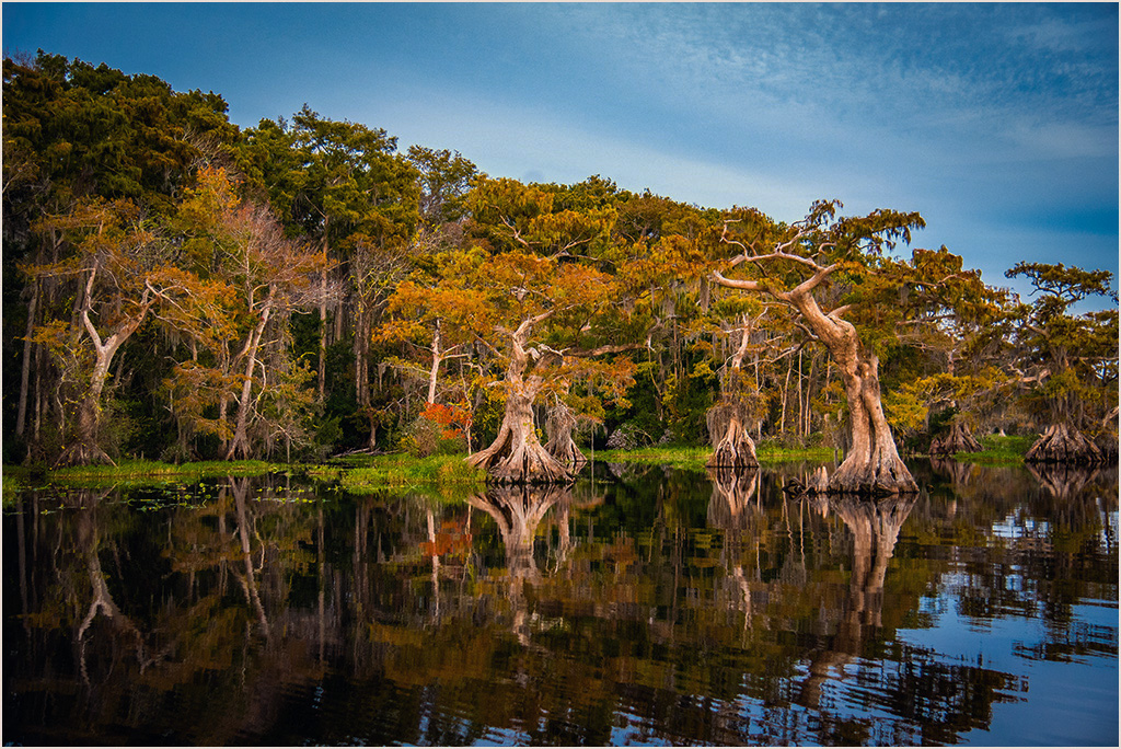 You bring out the unique shape of the trees (cypress?). Going back to a scene can give you a completely different perspective. The triangle shape of the trees and vegetation makes for an interesting image.