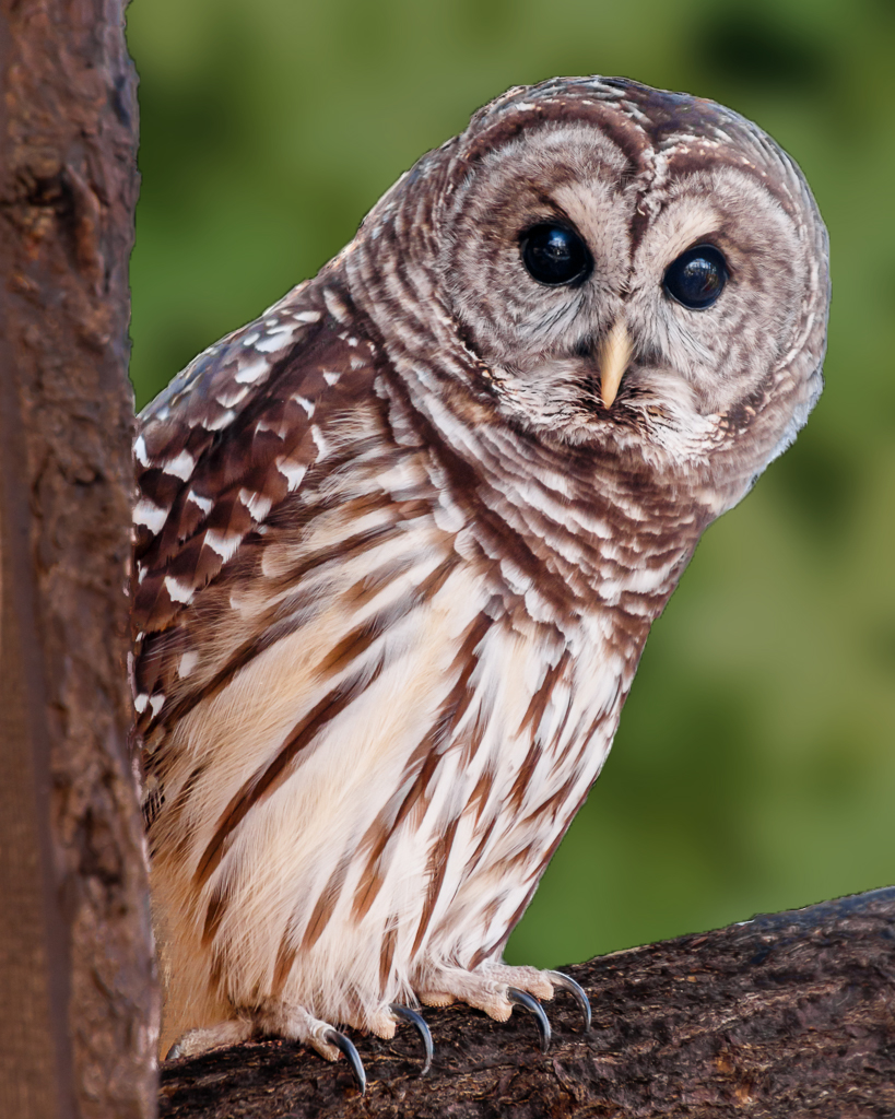 I think you did a great job with the owl, getting everything sharp and the catch light in the eyes. And I really like the way the owl is leaning into the frame. I agree the background is less than ideal, but I think the choice to go to black takes away from the naturalness of the presentation. I took the photo into Elements and replaced the background with one of their standard leaf patterns, played with the color, saturation, lightness, and blur until it looked somewhat natural, and saved it for the thumbnail. If you prefer the black background, I think it would help for displaying on our website to put a stroke around the photo to separate it from the background. |