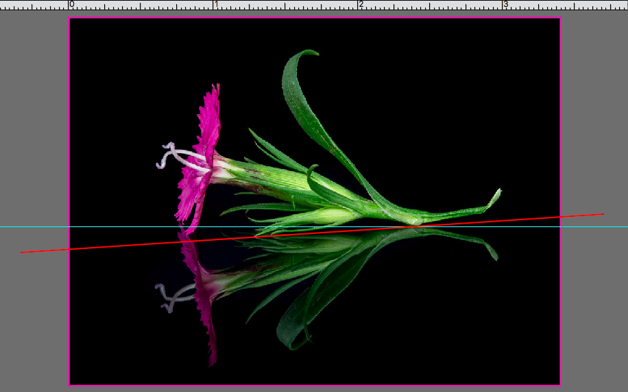 Great job! Everything look perfect to me at first. Then I noticed that some of the reflection overlapped the actual flower and that the line through the reflection was not straight. With my rusty science and art background I couldn't figure it out at first, so I drew some lines. In the thumbnail the blue line is parallel with the frame of the photo, and doesn't go through the plane of the reflection. So I drew the red line which goes through two points of the reflection (right and center) but not the third (flower petal). Gradually it dawned on me that the petals were farther from the intersection of the felt and acrylic. So much for my confusion. But it also led me to wonder about other outcomes if the angle had been even more severe: what kind of blending of image and reflection would you get? If you still have the setup, it might be fun to try. |