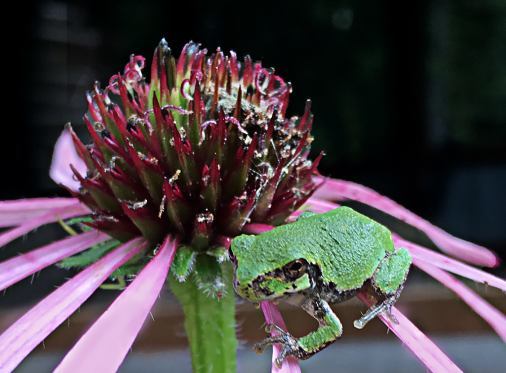 Good observation. I was so focused on the center cone of the flower and the frog, and the contrast of color of the frog with the pink of the petals, that I totally forgot to think about trying to correct the overexposure. The light and the limits of the cell phone native camera were not in my favor, and it seemed like a once-in-a-lifetime opportunity. Plus he wasn't hanging around very long. Instead of a vignette, I tried an additional crop, and filled in some color on the blown-out petals. I think I cropped a bit close to the frog's feet and could correct that if I were to use this for a competition. I definitely think your suggestion leads in the right direction. |