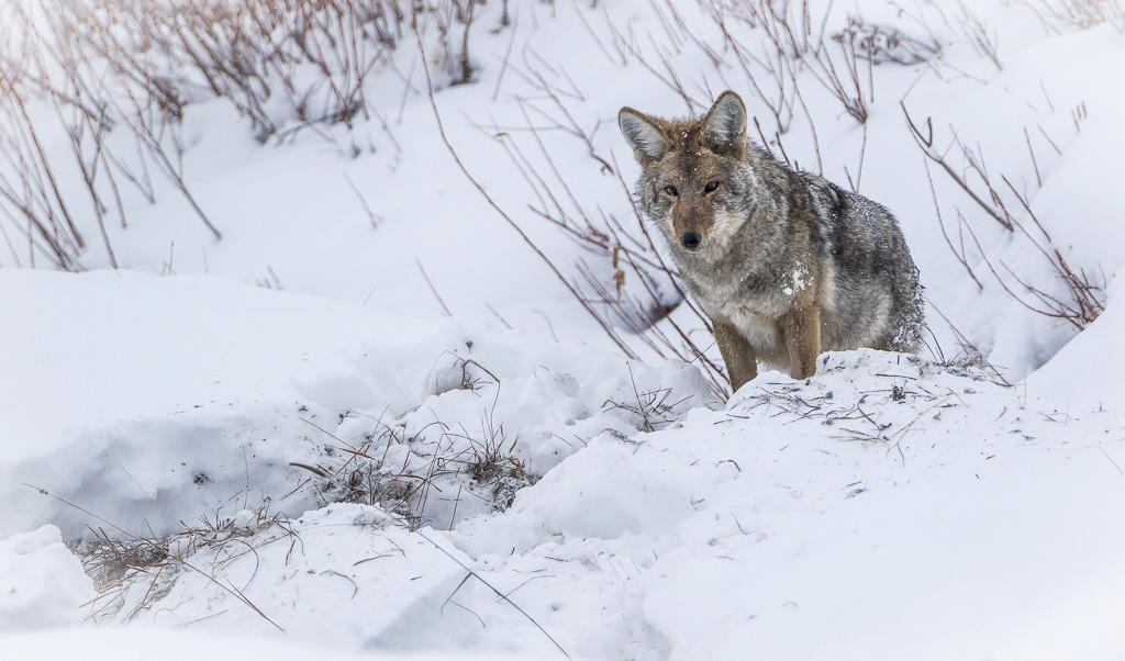 I think the image is beautiful, but the whites seem overexposed. I took it into Photoshop and tried adjusting the whites without losing any emphasis on the coyote. While I was there, I tried cloning out the stick I think Marla was referring to. For me the differences are small, but I think might be worth it. On the other hand, there is a bit of grayness to the snow, so maybe really white snow is like a photo with the sun in it and a bit of overexposure is the correct exposure. |