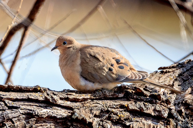I wanted to focus even more on the dove, so I did a different crop. I also took out the strong stem right in front of the dove's beak, and enhanced the catch light in the eye. I was tempted to work with the color of the feathers, as the doves we see in Wisconsin are more grey with a slightly rosy patch below the "chin" - but I like the fresh color of your dove. I think you did a great job with the sharpness and with removing the intruding branch. |