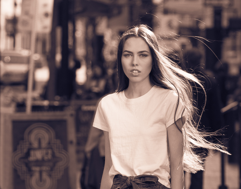 I definitely like the second version. I like that she is pretty squarely on the thirds line, but I don't like the distractions on the left. I took it into Photoshop and cropped out the two poles, leaving her a little more center, but more to my liking as being the undisputed star of the photo. |
