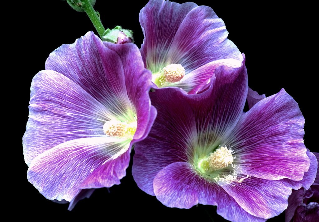 The flowers are beautiful and I like the way the cluster is placed from upper left to lower right. I think you captured the veining in the flowers very well. I do think that overall there might be a bit too much brightness, so I took it into Photoshop and used a curves layer to balance the brightness especially on the left, and then a selective color layer to bring back the depth of tones of the colors to see how it would look. |