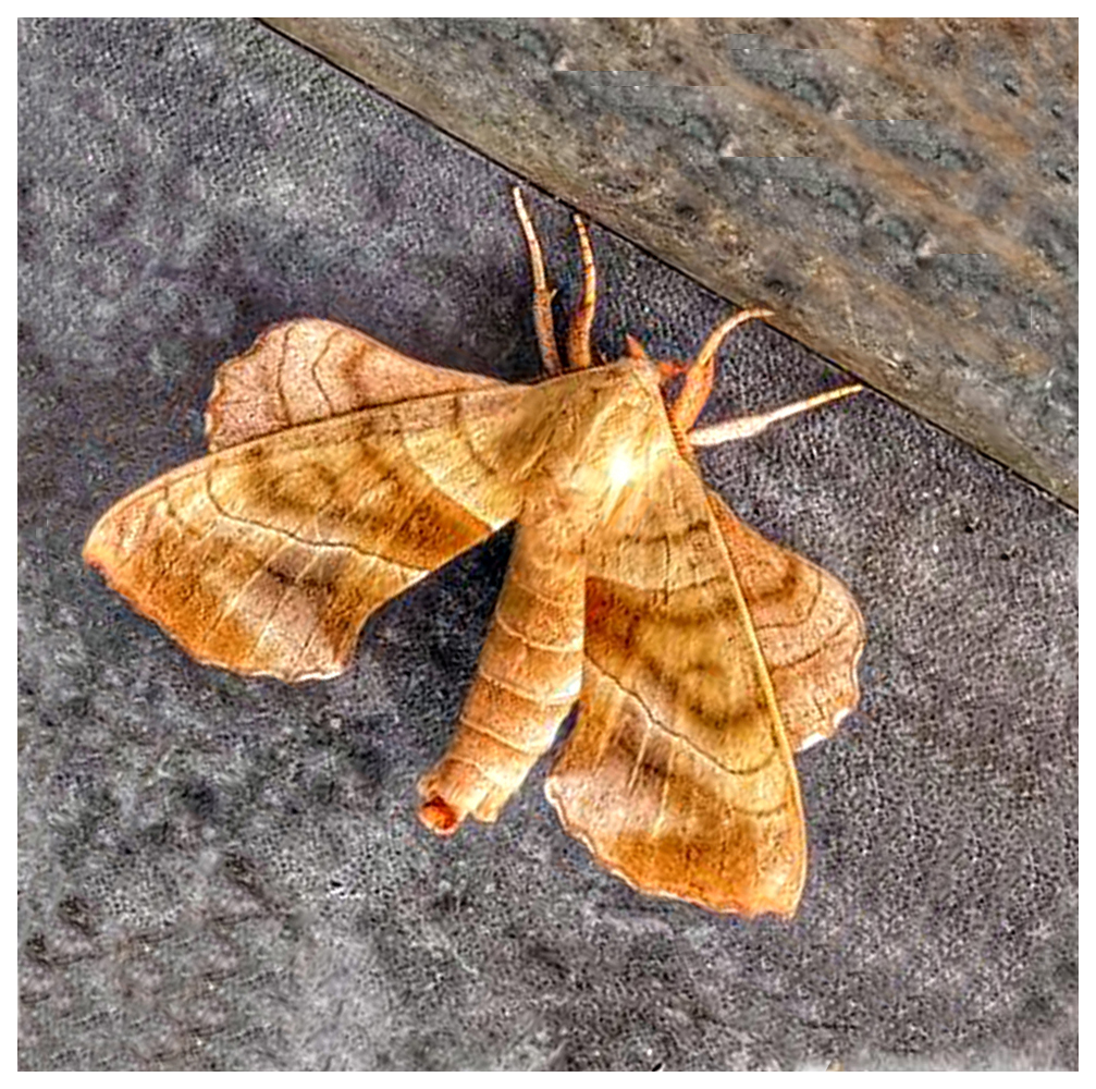 When I read Bill's comment, I thought it might be fun to have the moth at an angle so it looked as if it was trying to exit the frame. So I took it into Photoshop, rotated it, and cloned in the corners and redid the stroke. What do you think? |
