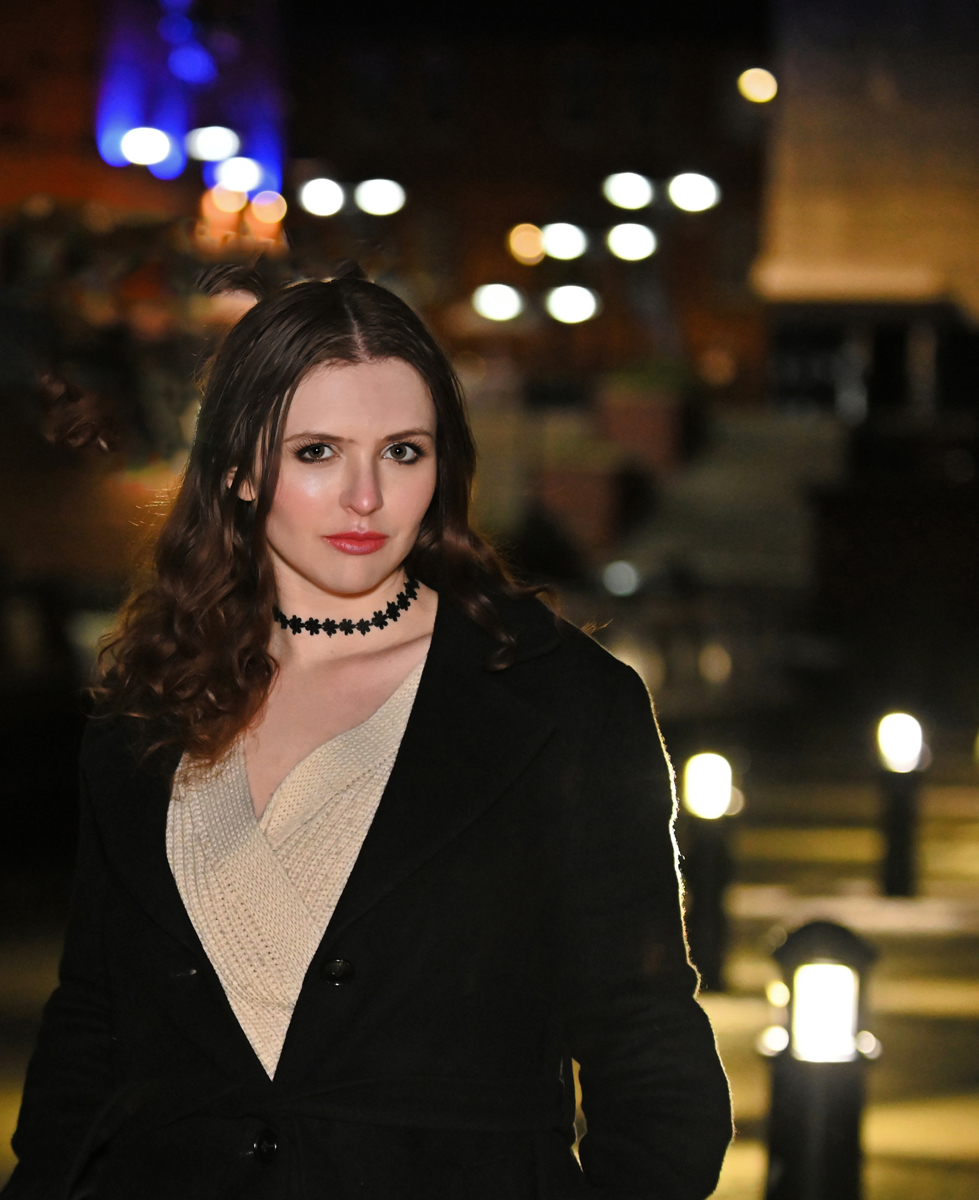 You have a good eye for model photography. I like the leading lines and the highlight on her shoulder and arm. I also like the great bokeh you achieved for the background. I do find the lights intersecting her hair to be distracting. I took the photo into Photoshop and used the spot healing brush to remove them. Responding to Ruth's suggestion, I cropped in from the right which had the added benefit of placing the model's right eye directly on the thirds line, as well as making her a more prominent subject of the photo. |