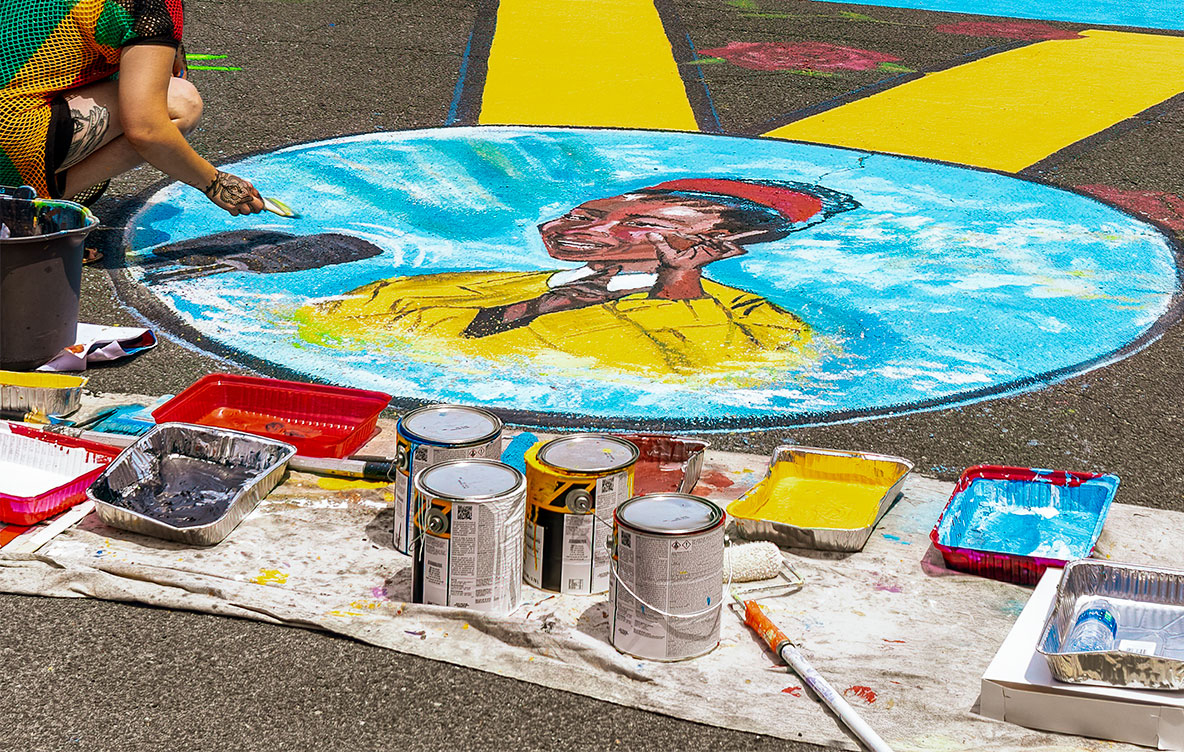 I like the color and composition as well, but this photo is so much about process that I find the artist's face almost another subject in the photo and my attention is divided and taken away from the art work. We are not really interested in who the artist is, so I cropped a bit more from the top, leaving enough of the artist to indicate the making of the piece. I find the inclusion of the paint cans and trays, and the bucket really tell the story. |