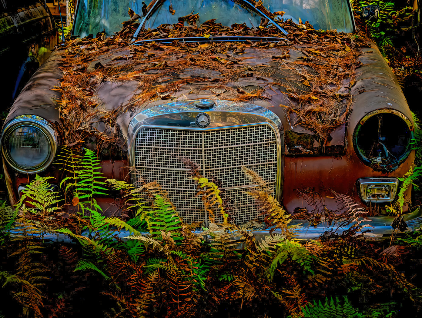 Hi Bob - Actually don't have an issue with the ferns either way, but did like what Expressionism did with them - but no big deal. I hope you don't mind, but I had a crack at your original image to make the needles/ leaves pop a bit more and also deemphasize the light on the left fender and hood - used the Burn tool, and the Topaz Clear Day filter at 65%. Not a drastic change from your original, but also not as dramatic as the Altered Reality picture that you produced. |