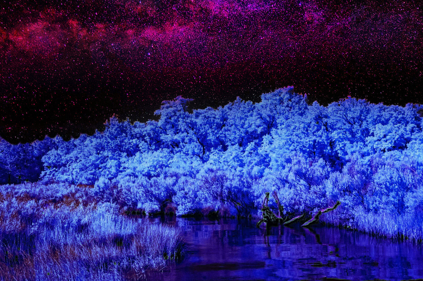 I'm a big fan of unusual, unique, creative photographs. So I like this IR image just for those reasons. Not too familiar with the IR effects, but always anxious to learn. From my point of view, removing the magenta coloured foliage, is a negative for me - actually I think it was the 2nd thing I noticed and really liked - a bit of contrast. I'm also not a fan of using someone else's art in images, even though they are stipulated. I rarely do it - but hey, that's just one of my cute little quirks! But a suggestion, since you are in a fanciful mood, why not change the colours of the sky to a contrasting, 'way out there' colour? See my attempt attached. |