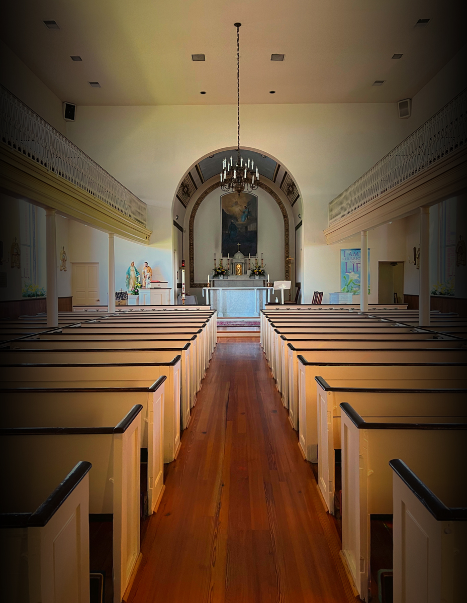 A very nice Architechtual image, with an iPhone no less - congratulations. I'm certainly one of those who underestimate the quality from these camera-phones. Nice and sharp and well exposed - nice soft colours and effective composition. I would only suggest one change (very subjective - different, not better) - I used the dodge and burn tool and lightened the front of the church, and darkened everything else (light touch) - in this version there is more of an emphasis on the altar area, instead of the pews. Be interested in your comments.