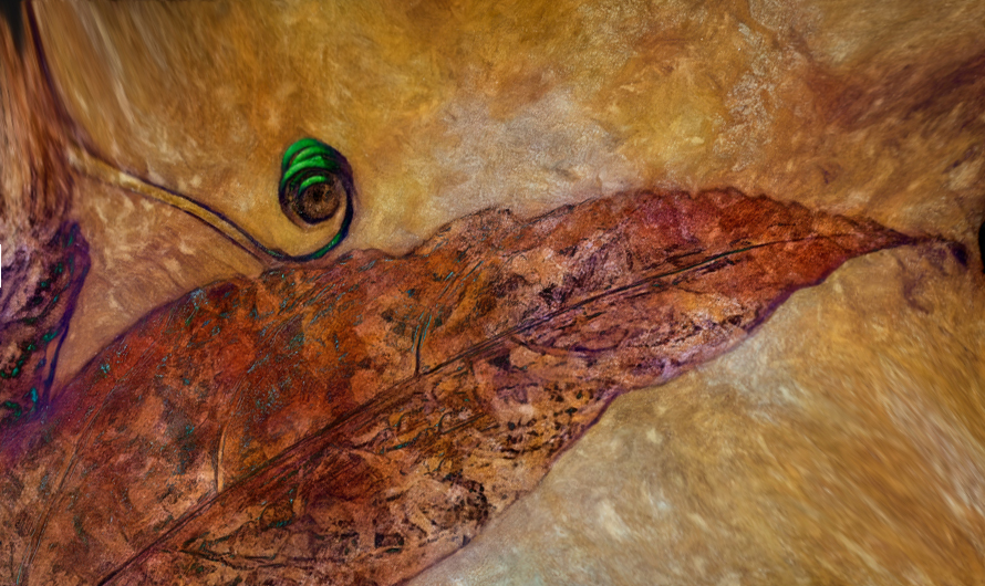 What an eye-popping image. Your adjustments in post processing worked really well. Love the overall 'feel' of this picture, especially the antiquing aspects. I only have one suggestion - would prefer the leaf at an angle, rather than straight across.