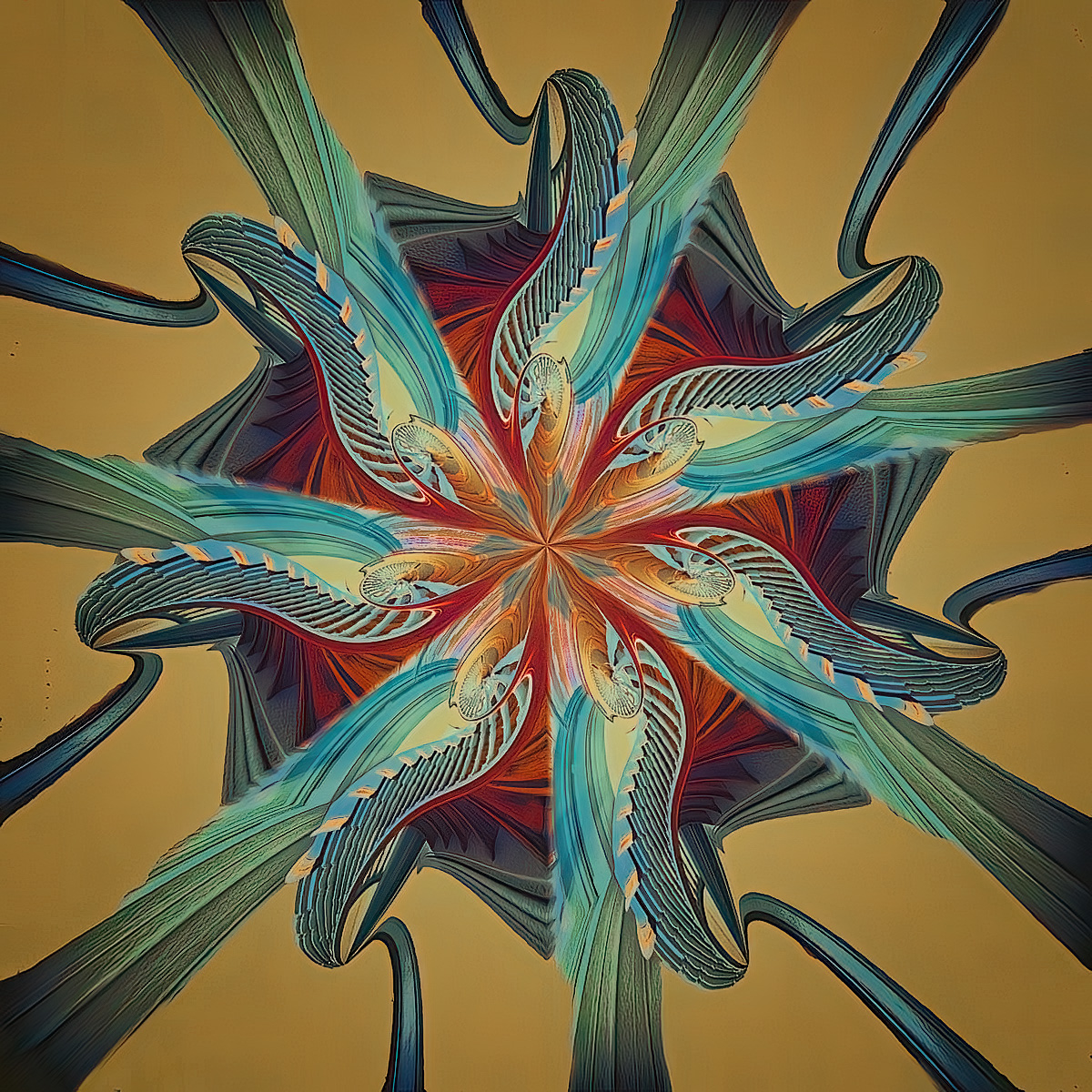 I like your abstract image. Although not a fan of kaleidoscope images in general, I do like the your colour selections. However, like most kaleidoscopes, my eyes have a difficult time to find a focal point, and consequently I only just get a general sense of what I'm seeing - just my take. |