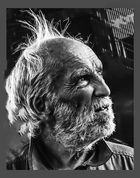 A very impactful portrait - good of you to catch it. Also a good idea to take it from a distance! Like the B&W effect on the face - works really well. I only suggest one change - very subjective, but I think the extra white subjects/areas in the frame are a bit distracting. See attached - did not spend too much time, and messed up the area over his right shoulder. |