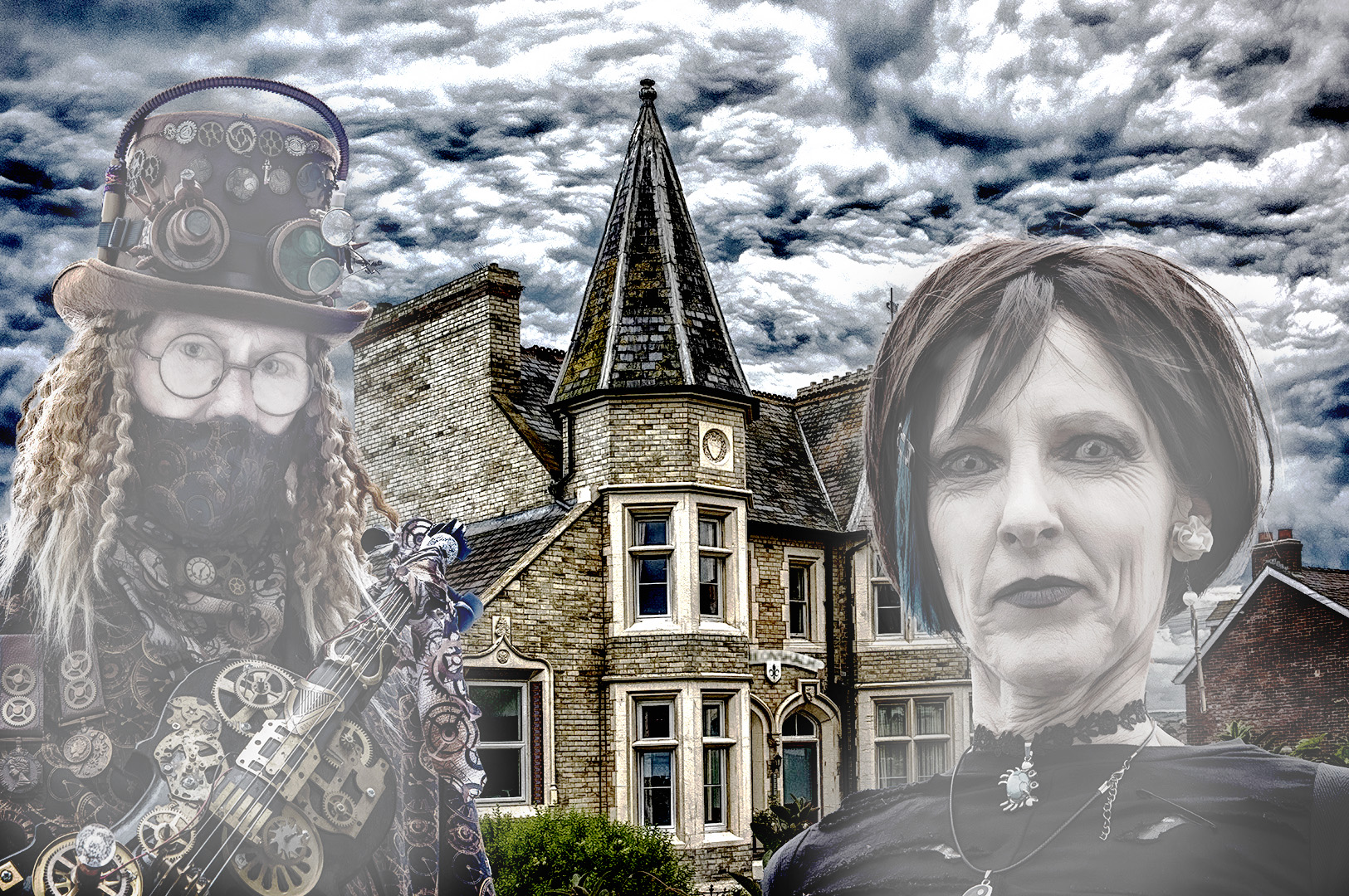 Another creative, interesting Steampunk image. I really like the house and cloud portion - the people, not so much. The title "The House", tells me that the house is the main focal point. However, when I look at the picture it's the people that jump out at me, and the house is a supporting actor. See my version. Desaturated the people, so they take a less important role in the story. But not really much of an improvement, as the amount of space used up by the people. |