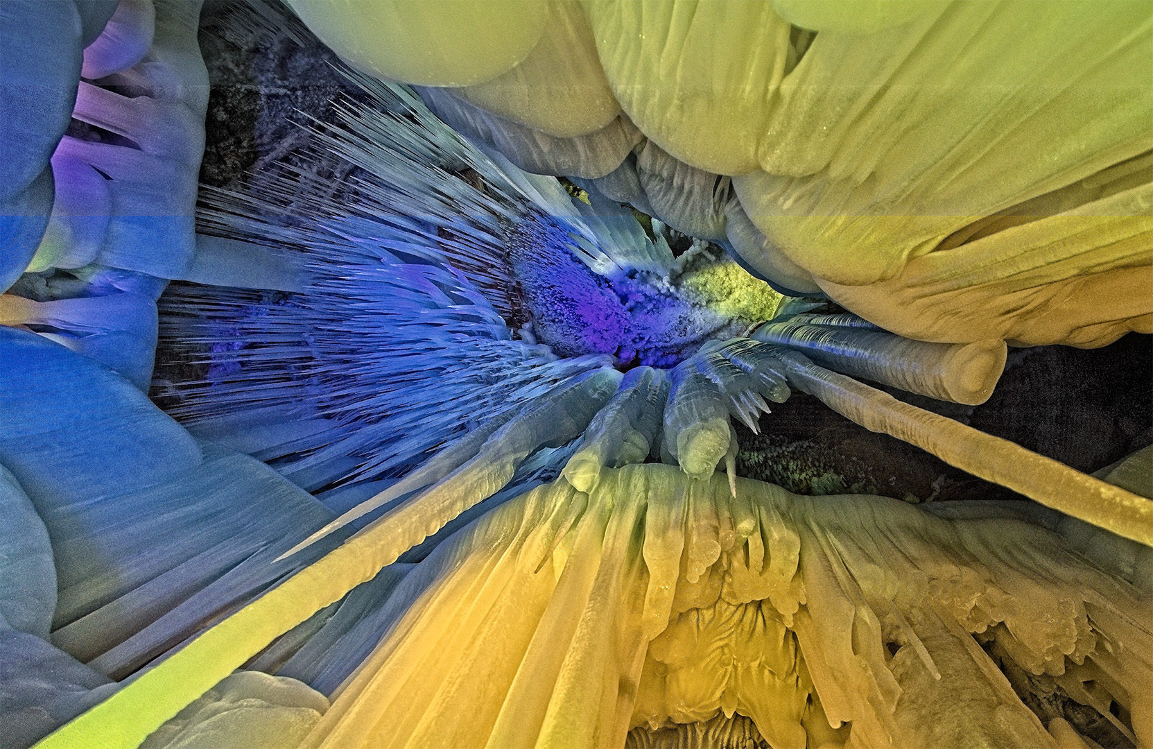 The lighting was changing so this shot was between lighting changes and contains analogous colors (I'm finally trying to learn a bit more about color). Norm, the shadow area you asked about is an area that is several feet in depth and there was little to no ice to catch light. I tried to open it up but with the shadows slider but there really is nothing there. I shot at f4 due to the need to get the image before the lighting changed but you are right if I could have used a higher f-stop it would have been interesting. I suspect what you are seeing is the beginning of a lighting change, below, with complementary colors with shadows open (please excuse the noise etc since I haven't finished processing this). |