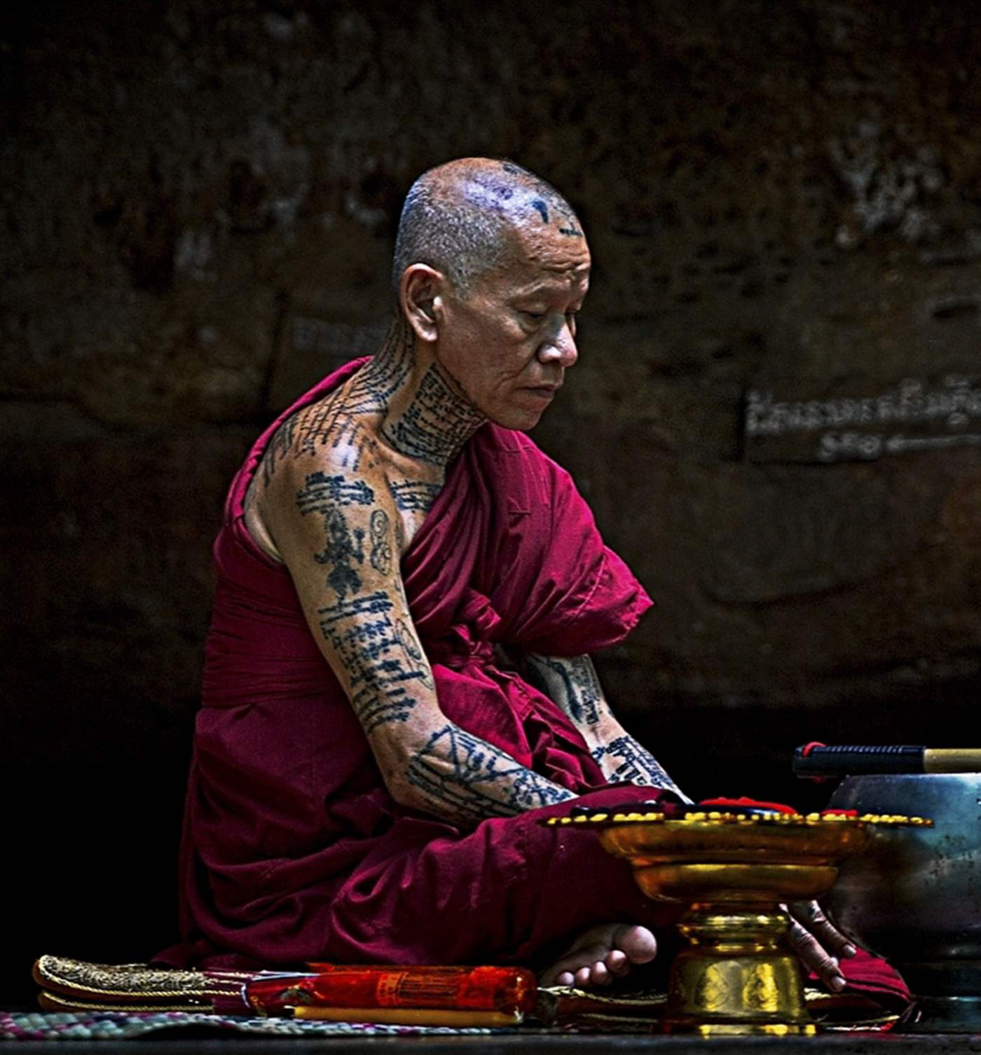 Thanks Norm and Stan. Great comments. I considered the stuff at the bottom a part of the story since he uses them in giving the blessing but clearly it is not something that one would pick up on just by looking at the photo. My error in leaving the writing. It is there to help identify the country as Cambodia but I can certainly darken it to reduce its influence on the eye. I didn't worry about typical dimentions but here is a copy that tries to incorporate comments.