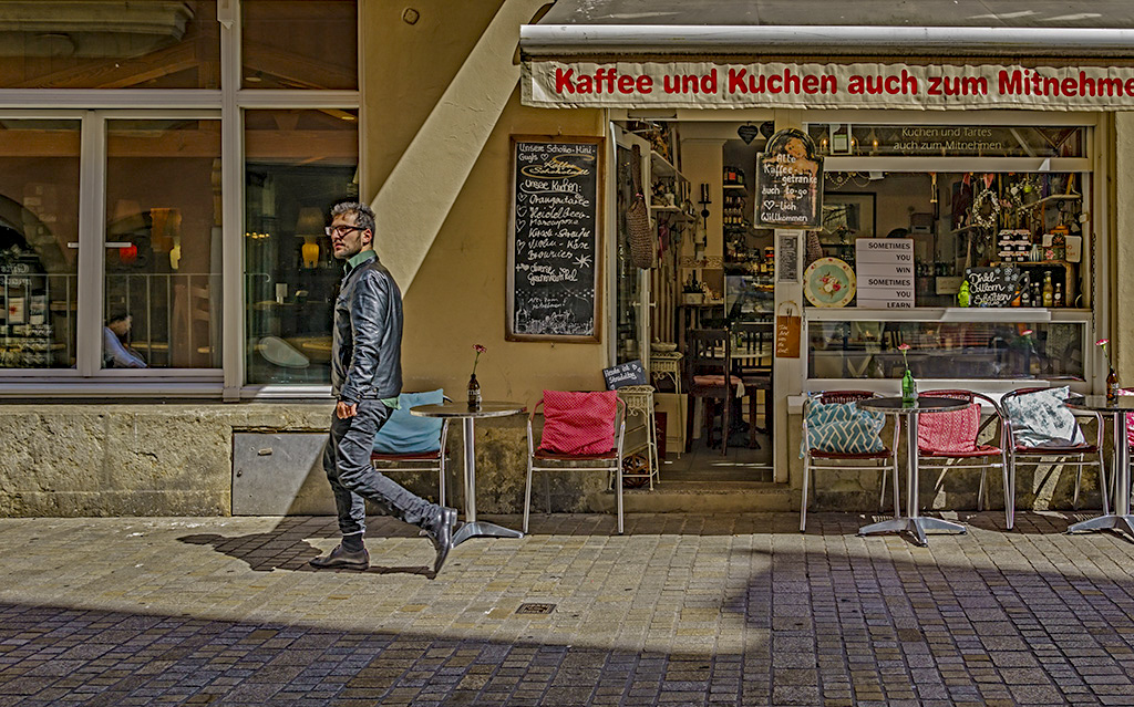 Gloria, you captured the man in motion and looking away from the restaurants. I Wonder if something caught his attention. I like the shape of the shadows in the ground. It adds tridimentionality to the image. There is the second human component, inside the other "store/ restaurant as Mofassirul mentions. The colors are a little washed out in my monitor. I reduced the brightness and whites, added black and clarity which improved somehow the contrast and definition of the colors. Good Street Scene. |