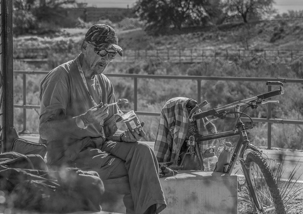 Dan, interesting image of the individual. He seems to be talking to you as he enjoys his peanut butter. Indeed the light condition were not the best, very harsh, there is presence of lens flare created by the incident light to the camera lens. You were able to bring back some detail is his face, but there is still room for more. I increased the light in the shadows, added some black, and reduced the highlights and the whites, and cropped the image to make it more intimate, and you still show the environment. |