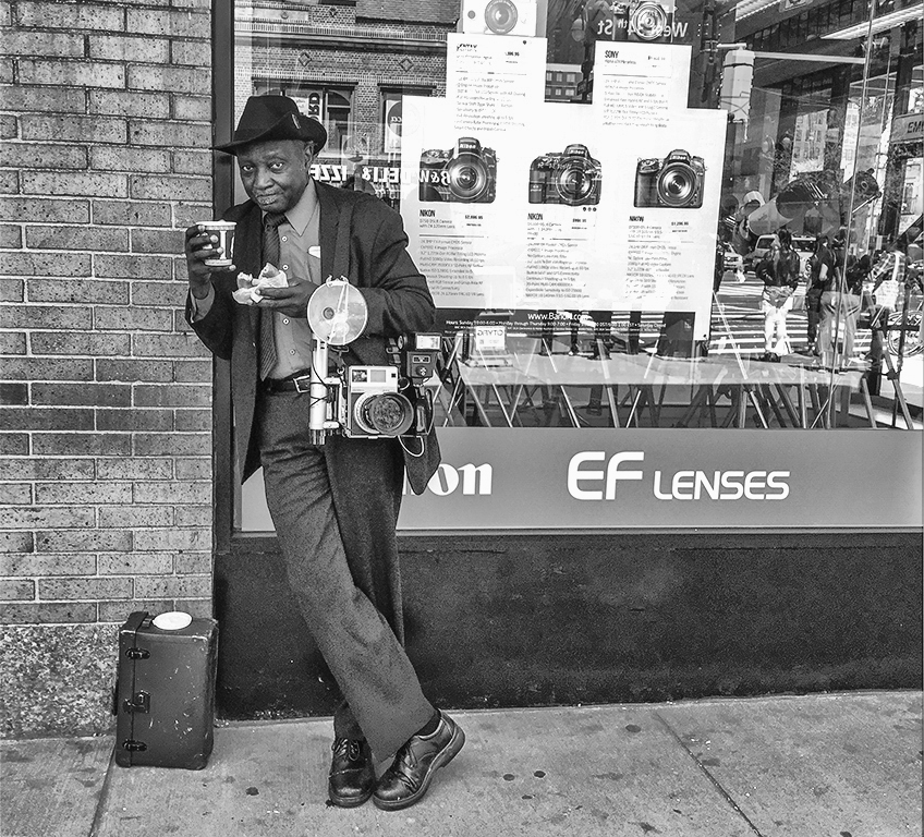 My impression is that this guy comes frequently to the store and posses around and likes to be photographed. No modern photographer walks around with one of this vintage film cameras. |