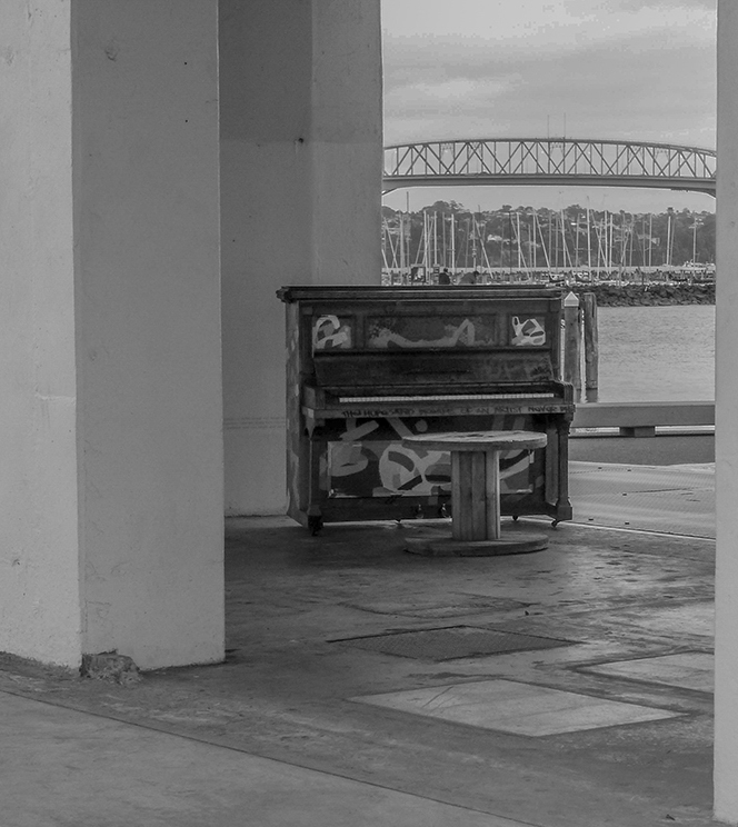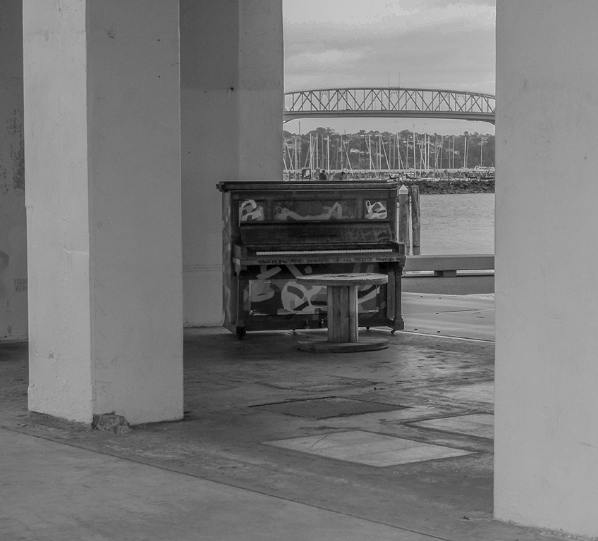 Liz, you have a good eye. I agree that it looks awkward to find a piano in the middle of an industrial area. I cropped the image to make the piano take prevalence and reduce some of the negative space, now the pillars frame the piano.Increased the light in the shadows, and now you can see some graffiti detail on the piano. Also, by a selection decreased the brightness in the open space. Interesting as well is the improvised chair for the piano. |