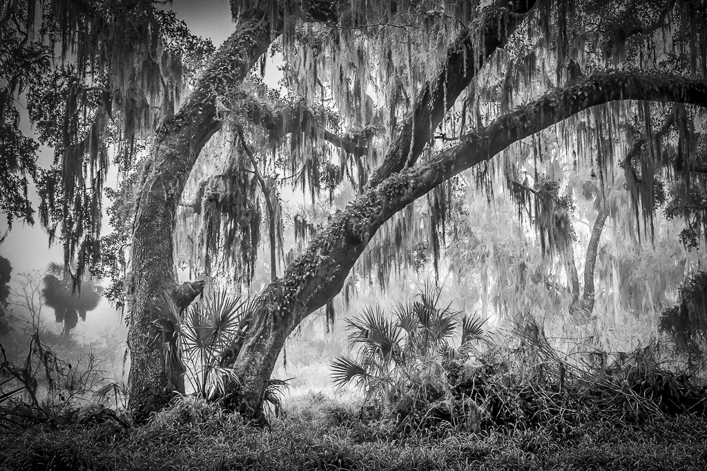 Bill, this image is really beautiful. The combination of the Spanish Moss and the fog gives a mysterious appearance. You were able to obtain great contrast with good whites and blacks with Silver Effex 2. I like the composition as is. I added some clarity, contrast and increased slightly the light on the shadows which brings out more detain on the tree trunk and makes the fog more obvious. To make it more intimate I added a vignette. |