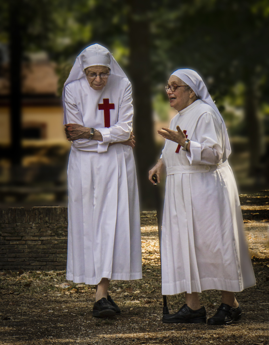 Joe, great image. You captured the nuns in deep conversation. The tall one is concentrated and listening. The image is sharp, and the whites are well balanced. There is a bluish fringe around the heads of the nuns that I could not eliminate. What I did was do a selection of the background and applied some gaussian blur and decreased the brightness. Also added a vignette. Both make the image more intimate and eliminates some of the distracting elements in the background. |