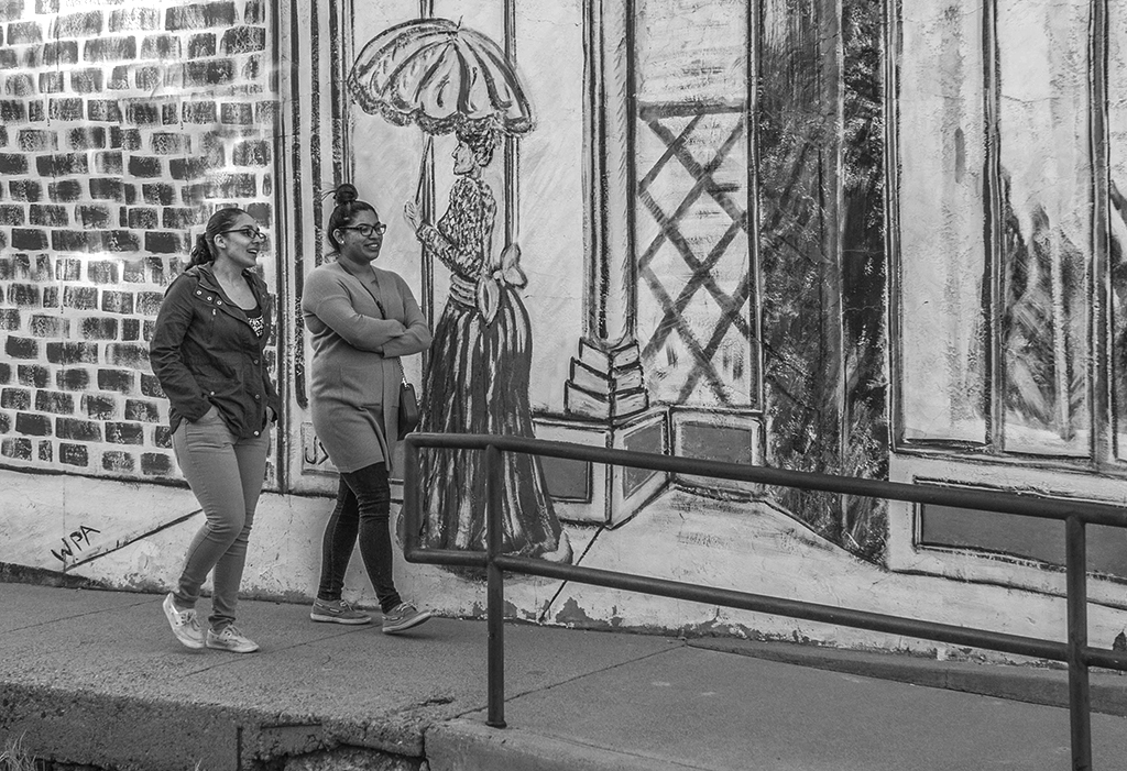 Dan, great capture. I like the contrast of the two ladies walking in one direction, and the graffiti in the background with the lady and the umbrella (Parasol) going in the opposite direction. I flipped the image, so the ladies move from left and high in the frame, to right and lower in the frame. Also made the vertical lines in the background straight by rotating slightly the frame. The brick wall behind the ladies has several very bright spots, so I cloned the wall to cover them partially. Added a slight levels contrast as well. |