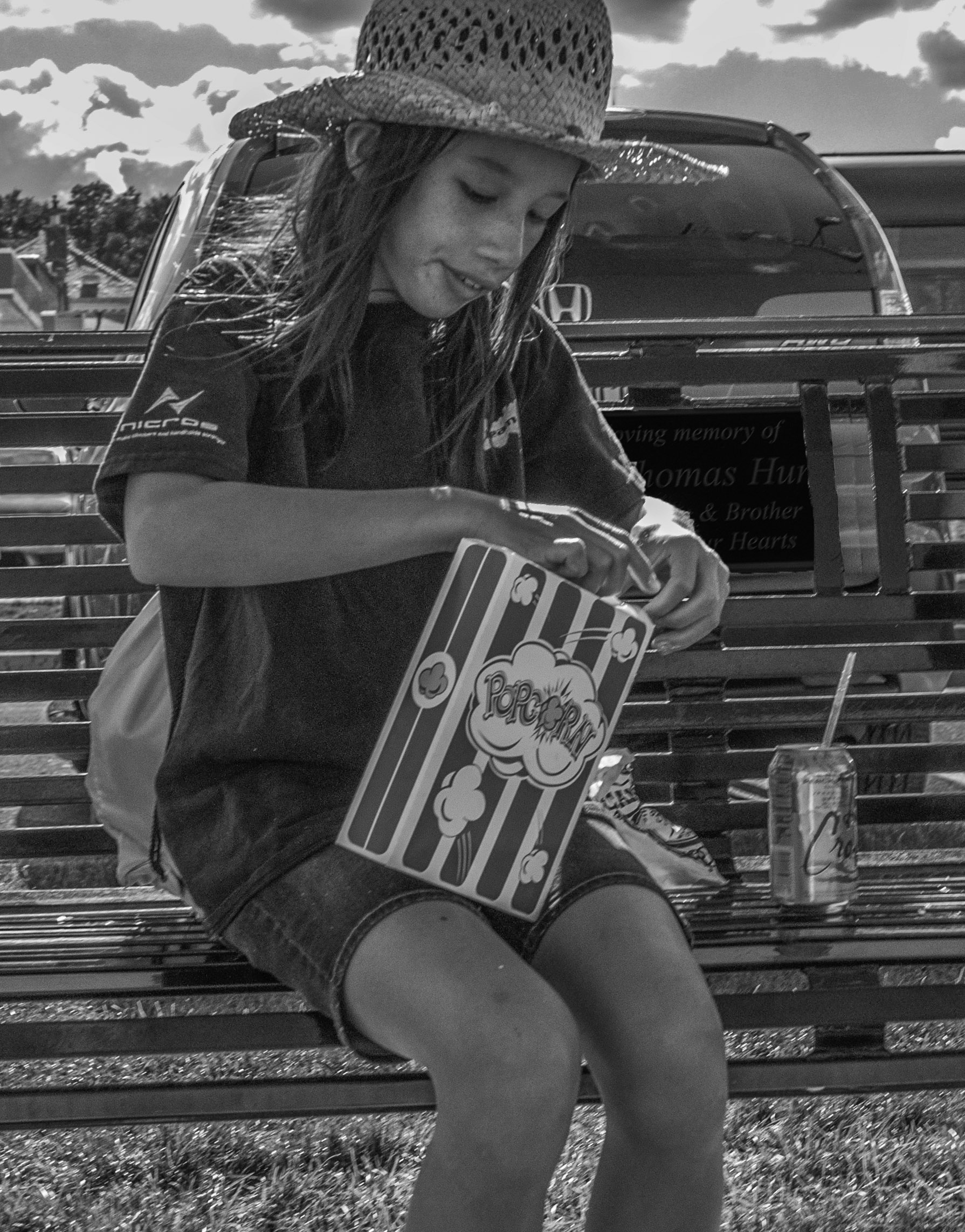 Dan, great capture. Indeed you got the image at the pick of the action, when the girl is all concentrated in opening the pop corn box, and with a smile in anticipation of the treat. The cloud are a little overexposed and can not be recuperated, and the face an dress are a little dark due to the backlighting. Also, the sign in the back of the bench with clear letters is a little distracting. I added light and exposure and cloned out the sign. |