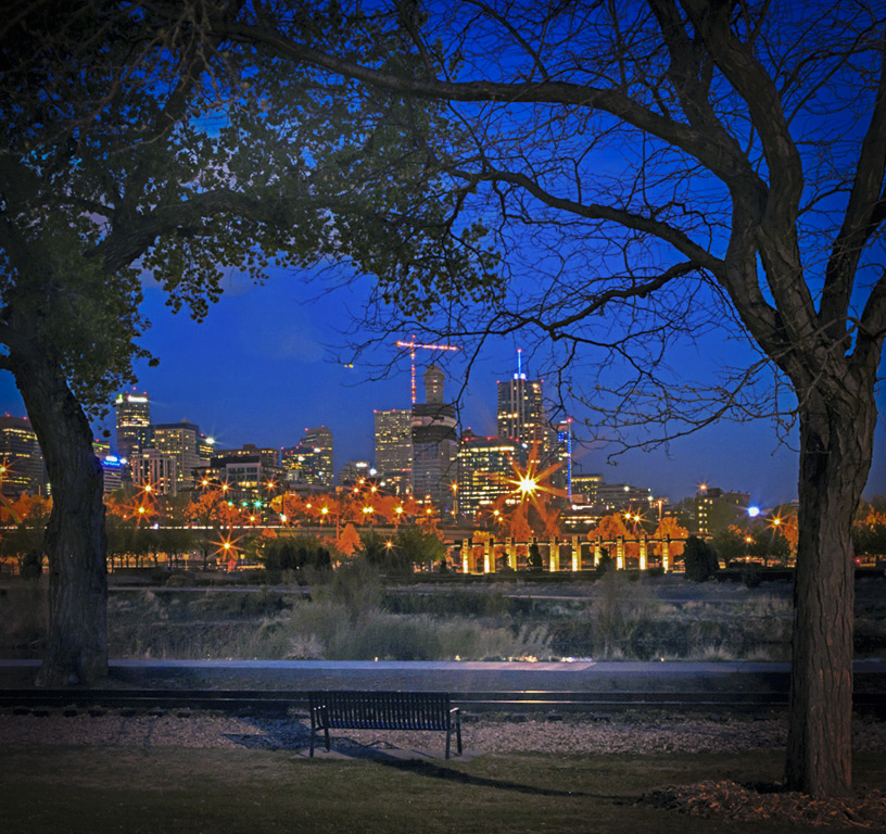 Guy and Ian's adjustments and comments say pretty much all there is with the image. Indeed all the details in the foreground came out and the blue in the sky (blue hour) was augmented. The only suggestion perhaps is to crop a little from each side to remain with the framing trees and the city in the middle and add a vignette to keep your eyes centered on the cityscape. |