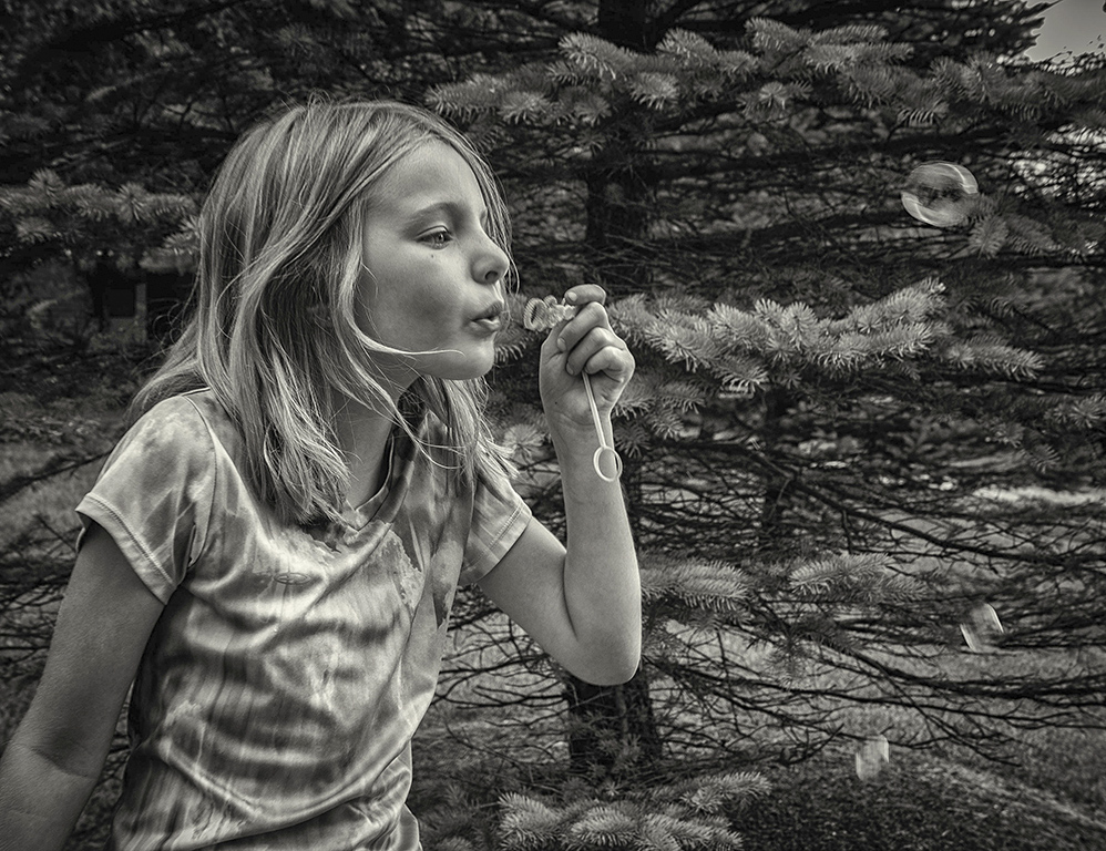 Dan, nice image. You captured the girl at the pick of the action showing the three bubbles. She looks deep in thought and enjoying it. The image is sharp. I added some light to the shadows, and a slight levels adjustment for more contrast, and I like it better flipped. |