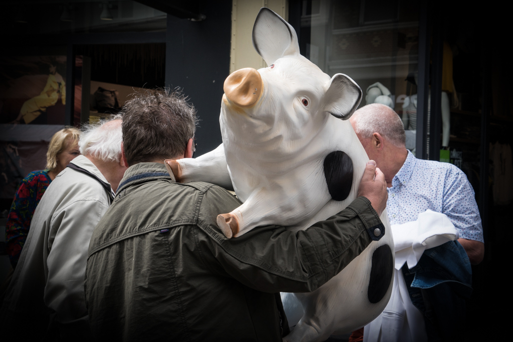 Daniel, indeed the white pig is the center of attention. It is a little soft, but not distracting. Well placed in the frame. The human interaction adds to the story. I just added a dark and tight vignette to give the whole emphasis of the image to the pig. |