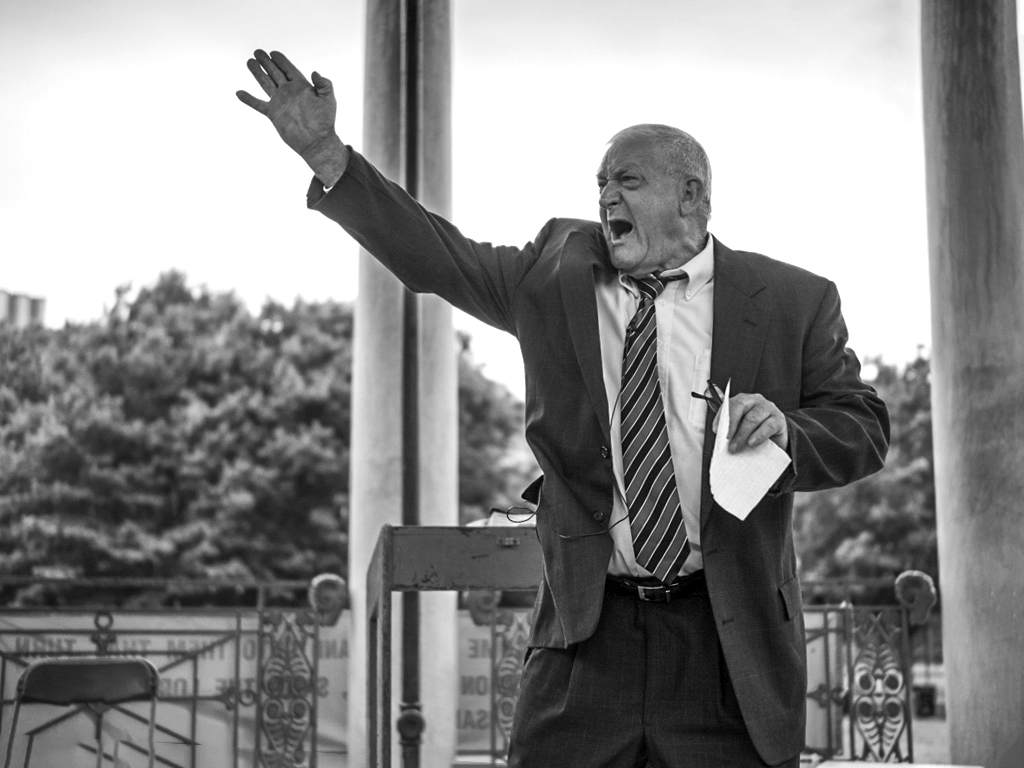 Ed, indeed you captured him at the peak of his declamation with his mouth still open. The right arm up with the fingers spread out gives more emphasis to the image. The B & W interpretation also works. You framed the man between the two pillars, which I made straight. Also added a little more light to his face to see more details. The image is sharp and well composed. |