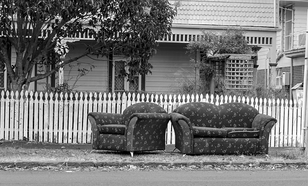 Liz, you can sometimes see this type of street images in the US specially when there is "Bulk Garbage" pick up, people will bring out all the useless items that will become treasurers for other people. Yes your image in well composed with the seats of center. I did straightened the image, cropped some from the bottom to eliminate a white line and some dead space, and a little from the top and left side of the frame. Decreased the whites, added some black and clarity, and now the contrast and detail is better. |