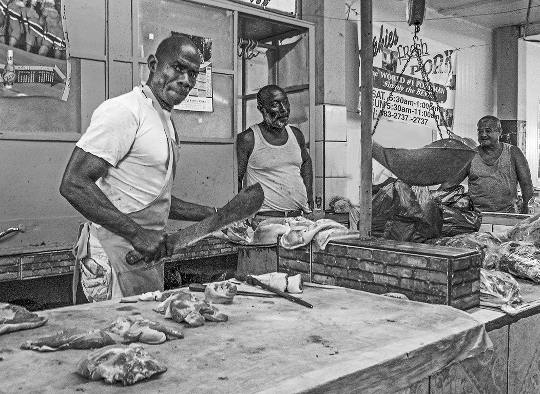 Gloria, this is an interesting photo of the butcher with the machete in hand ready to cut the meat, but was distracted by your presence and turned to gaze you. The other men in the frame are minding their own business. Actually the man behind the meat scale is almost completely blocked, and therefore slightly distracting, and breaking the odd number, so; with a little photoshop magic, he is gone. I am curious to see the image in full color. Nice composition, and sharp in spite of the low shutter speed. |