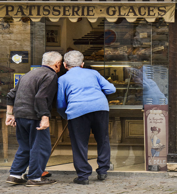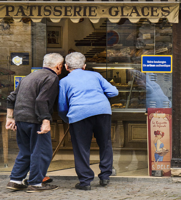 Joe, the two men are really looking intensely into the bakery. You can tell by their body language. The blue sign complements the story "Your pastry chef is an authentic artisan". The image is sharp. I find the yellow pillar to be distracting and pulling my eyes away from the main subject, so I cropped it.