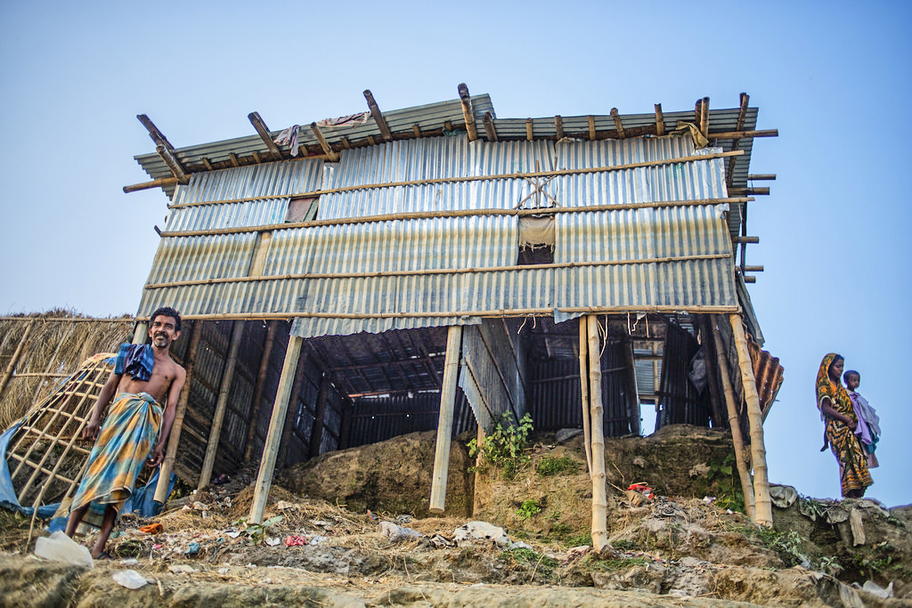 Mofassirul, it is amazing how people become "creative" on adverse conditions. It is really impressive how this construction stay up being so fragile. Obviously the man is proud of his accomplishments, and the woman holding the child is another manifestation that life goes on and tells the story. Your vantage point and your position at the time of creating the image gives this optical distortion. I added some light to the shadows and now you can see more detail under the the house. |